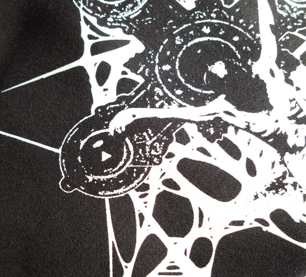 White front print and sleeve print on black Kariban K356 shirt (180g).